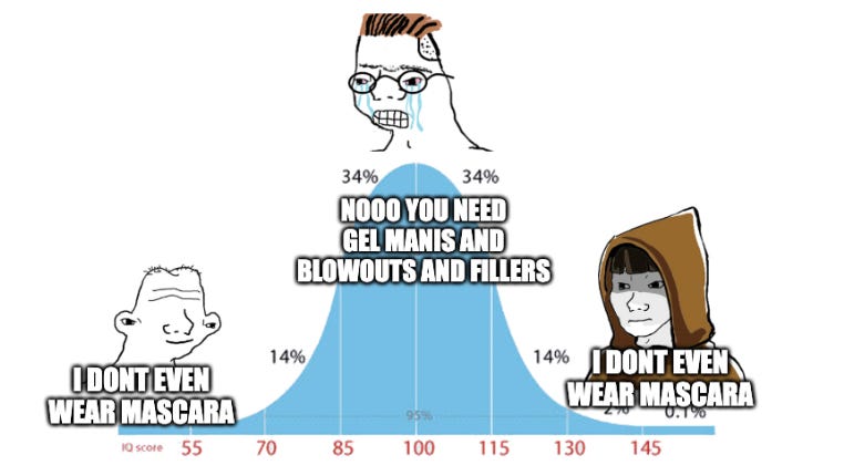 The author isn’t wrong, per se. She’s right that over-the-top high maintenance looks read as less elevated, less elegant, and less chic. It actually feels very obvious to the point that I’m surprised anyone needed an explainer. But there were a few moments where she described a certain horseshoe effect of beauty where the nonchalant, effortlessly chic aesthetic is indistinguishable from the way someone who actually doesn’t give a shit about fashion at all might look. For example, she says that true fashion insiders don’t wear nail polish or even mascara. This led to a bunch of people who don’t put any effort into their appearance, and have no interest in looking like a fashion insider, patting themselves on the backs for being ultra-chic by mistake. It’s giving: